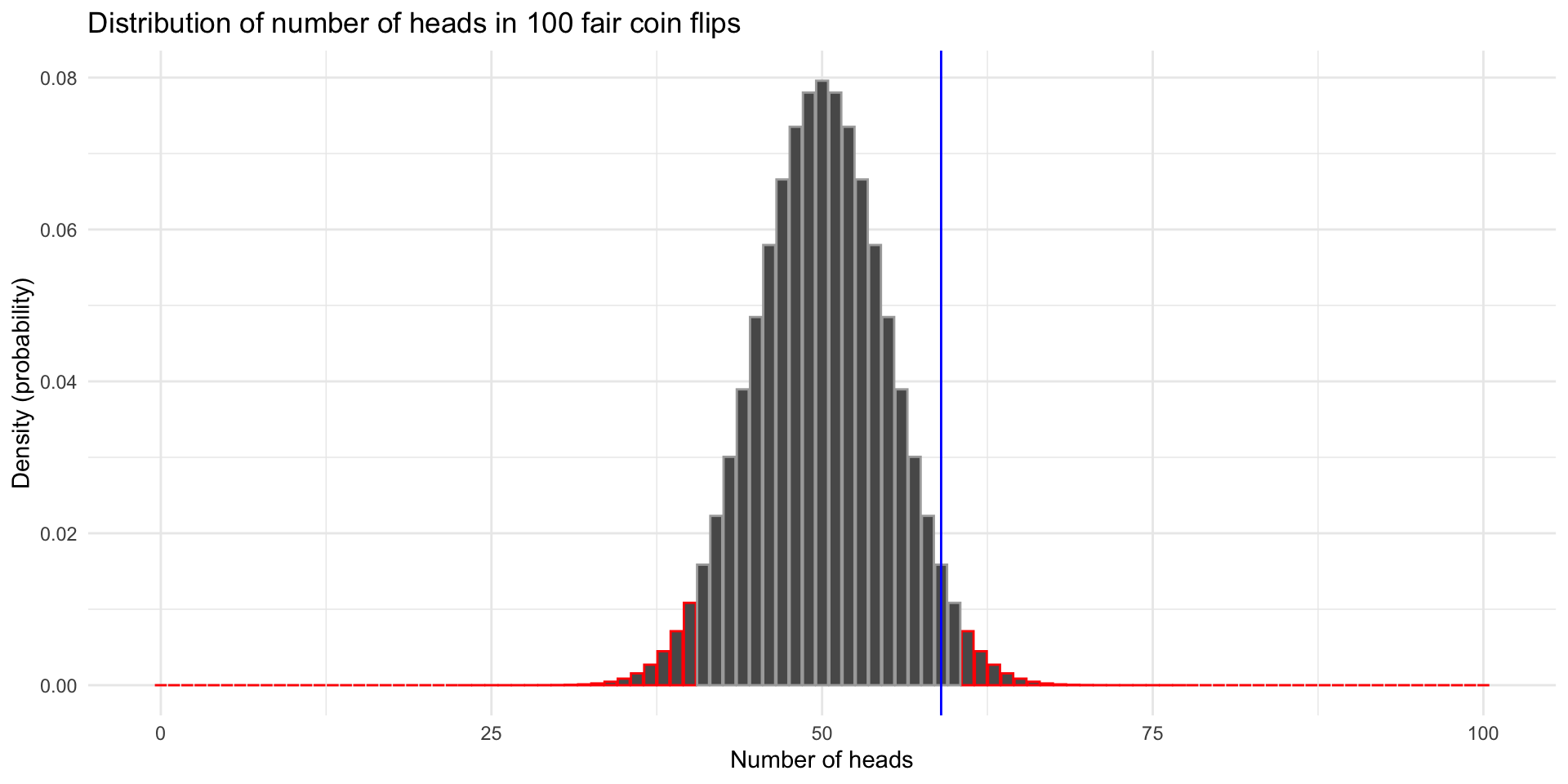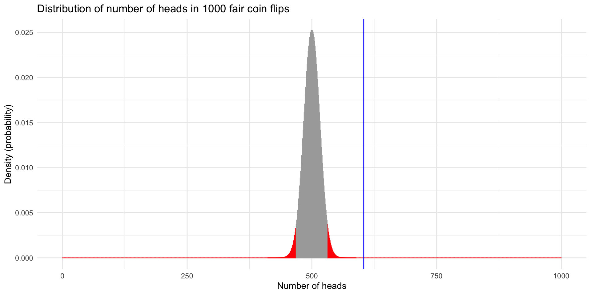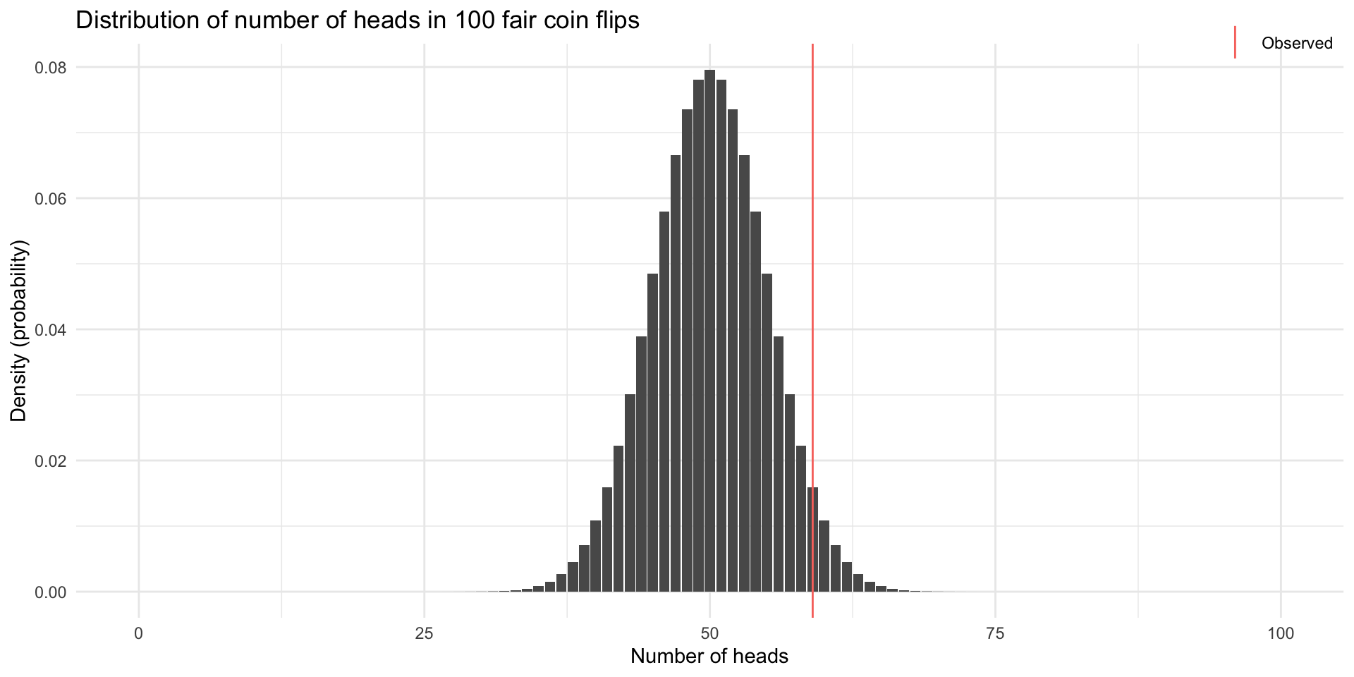 If \(p = 0.5\) were true, how likely is it to observe the number of heads we did?